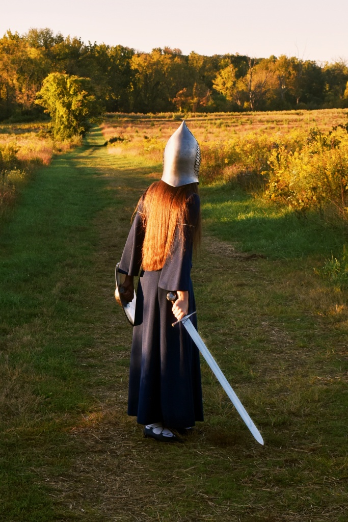 What do you like to do when you have a free Saturday morning? I prefer sleeping, but on occasion I will venture out, wearing something a little different. I awoke before dawn, raided my brother’s closet and stole his shield, sword, and helmet (items that all brothers have sitting around no doubt), packed my camera, chose the wrong shoes for field terrain, forced my sister to come with me, and in rushing out the door forgot any sort of coat. No matter, the day would not be spoilt by the cold. Or the wind. Or the frosty wet grass. I consider the cold I later caught by running around in a valley on a blustery morning, a mere expense of high adventure. We suffered no casualties, save a bruised nose. I really must get better at putting on medieval helmets if I am ever to succeed in battle. I do myself more injuries than I would my enemy.