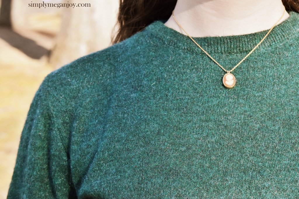 Both the sweater and cameo necklace once belonged to my grandmother. The sweater, I’ve heard, she had since high school, and I’m so happy I get to wear it. It makes it easy to remember her. Everyone who knew both of us knew how much we looked alike. I’m just so thankful that I can remember her by wearing the clothes she left for my sisters and me. I never truly got to say goodbye, but I know I’ll see her again soon. And until then, I’ll don her fashionable attire with an abundance of joy, and then hand it all down to the next generation. You definitely had great taste in fashion, Grandmom!